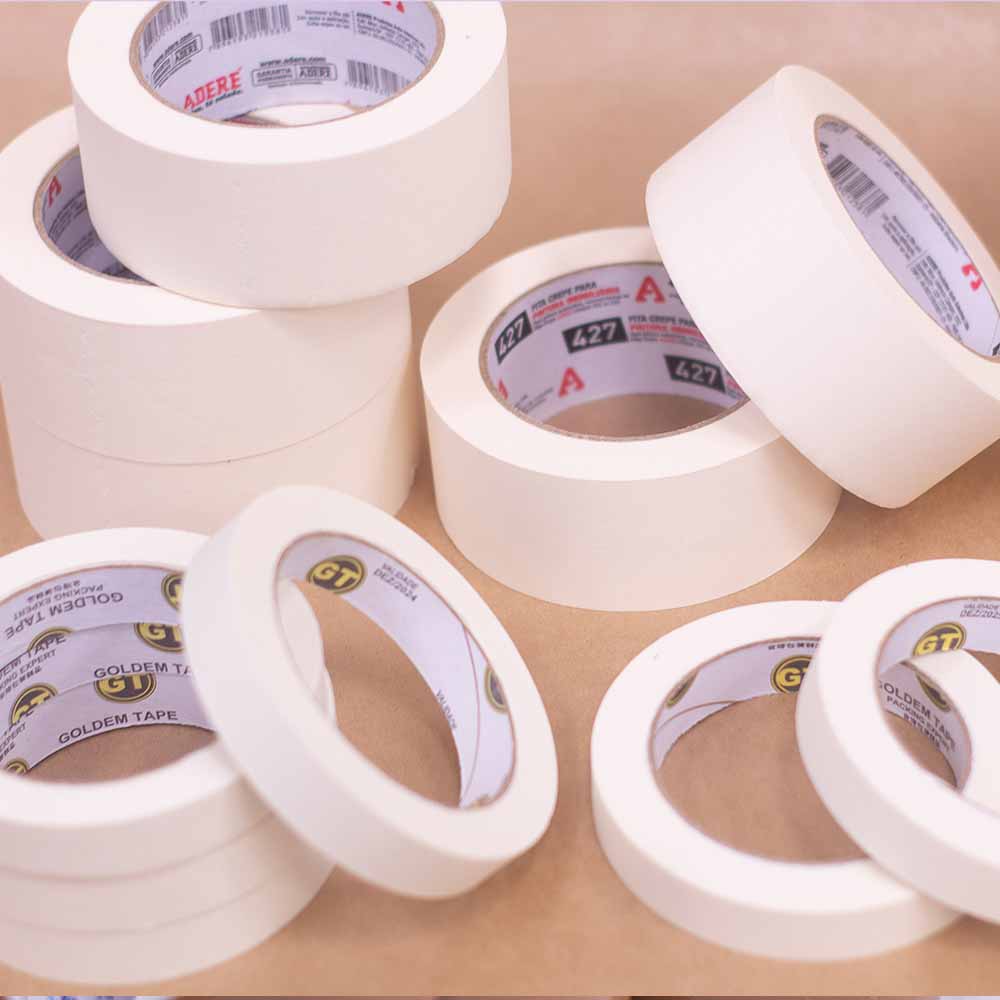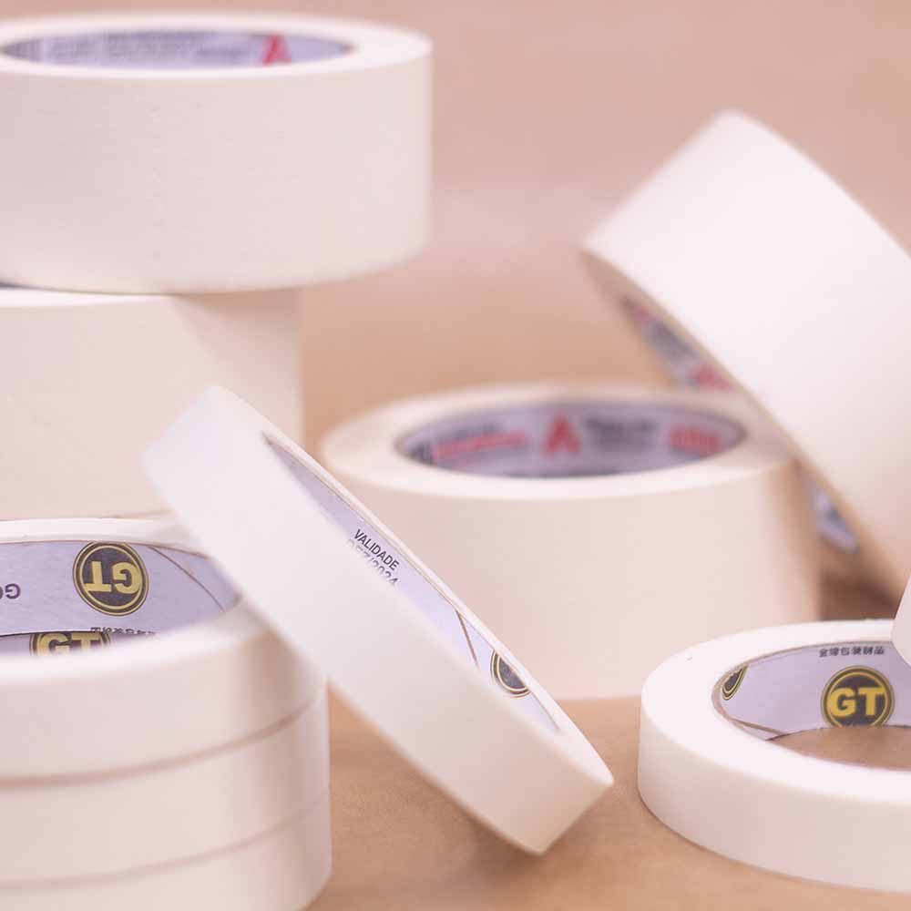 Fita adesiva com dorso de papel crepado na cor branca.